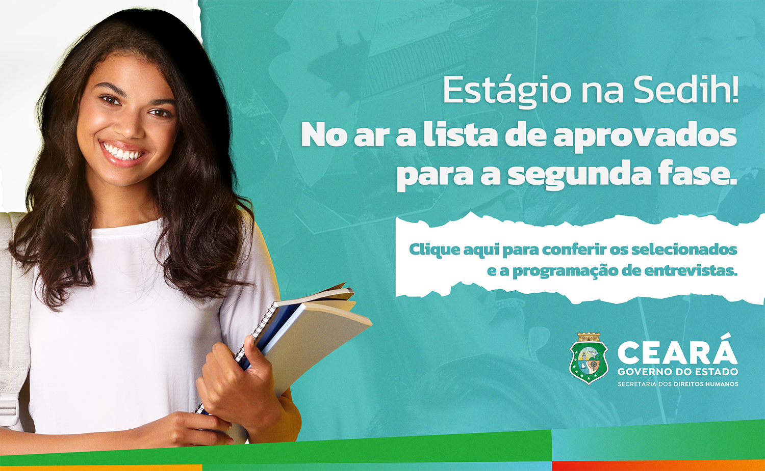 A Secretaria dos Direitos Humanos do Estado do Ceará (Sedih) torna pública a lista dos candidatos aprovados para a segunda fase da seleção de estágio para vagas de nível superior. As entrevistas da nova etapa devem acontecer entre os dias 15 e 29 de janeiro de 2026, conforme programação estabelecida pela Comissão Examinadora.