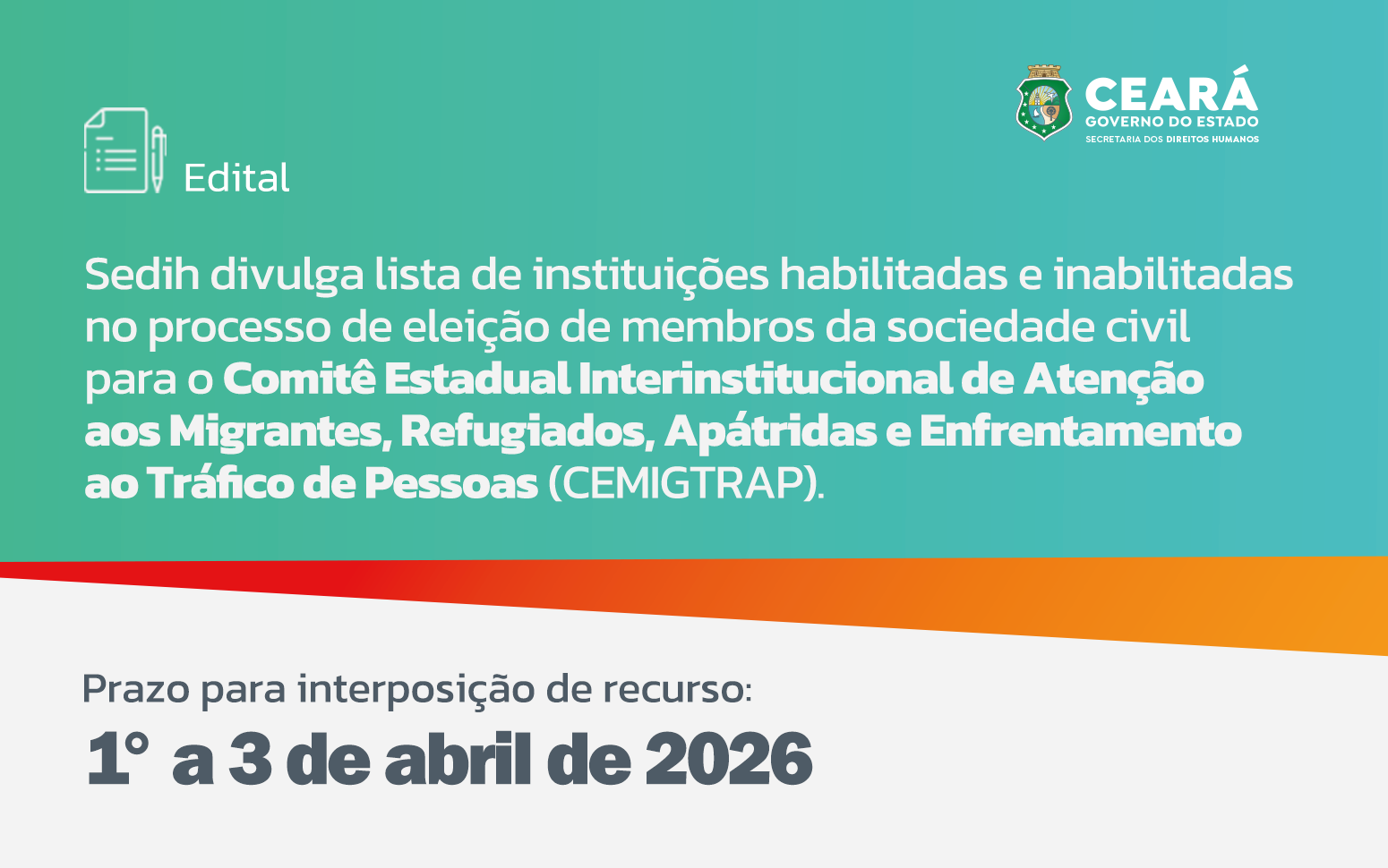 O colegiado reunirá representantes de diferentes Secretarias de Estado e membros da sociedade civil para fortalecer a articulação institucional e acompanhar a implementação das políticas públicas voltadas à migração, ao refúgio, à apatridia e ao enfrentamento ao tráfico de pessoas no Ceará. O resultado final da relação das entidades representativas da sociedade civil eleitas deve ser publicado no dia 15 de abril.